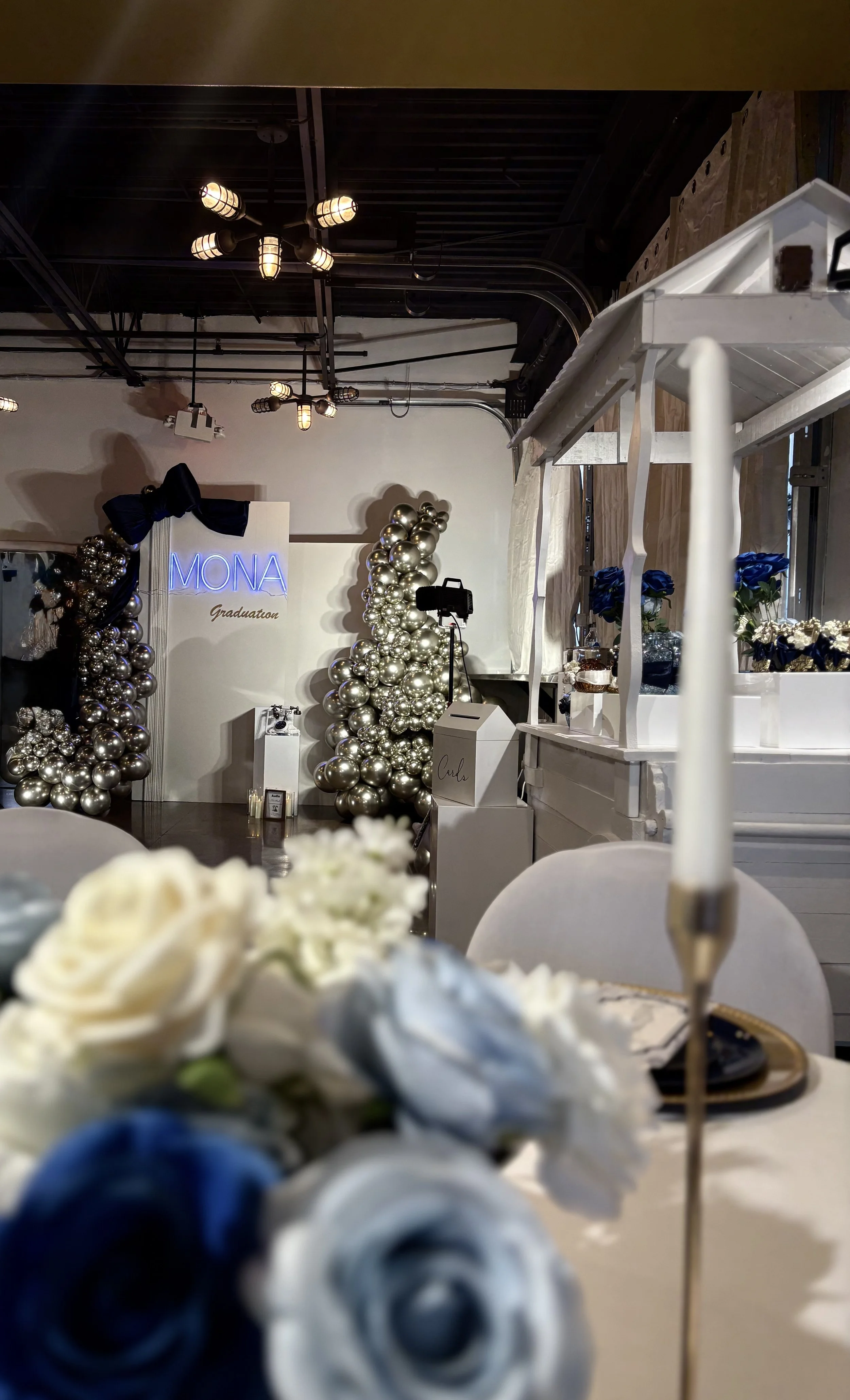 A navy blue statement bow, luxe white-gold balloons — because graduation deserves a little drama.