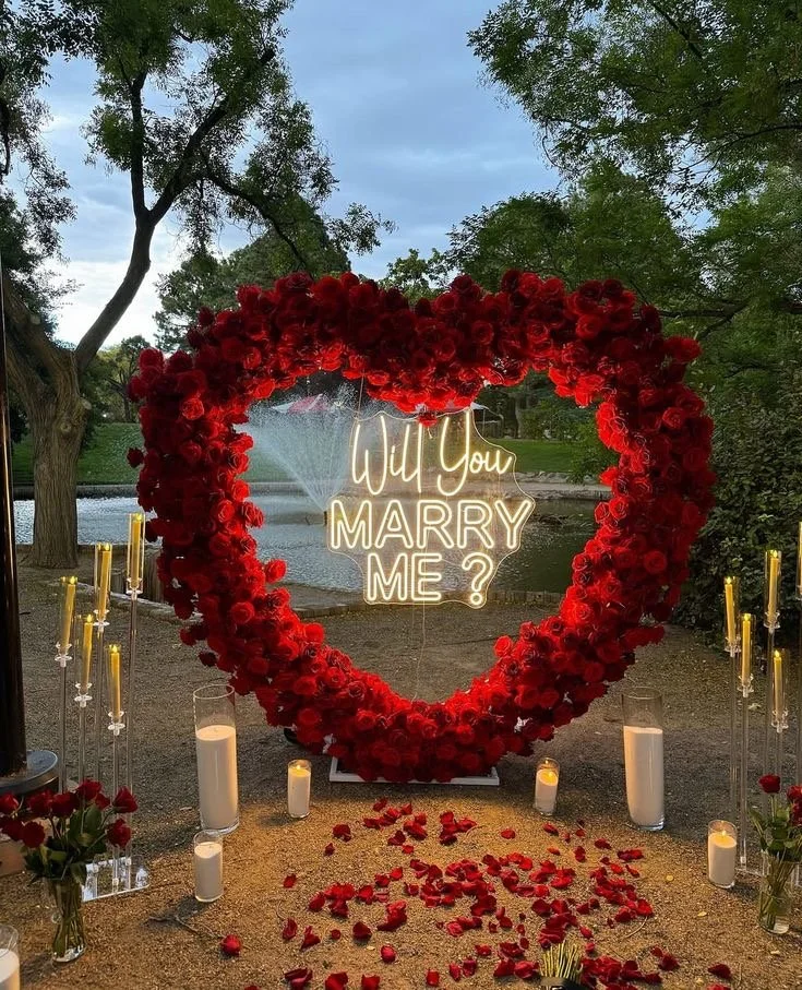 A sea of red roses, glowing candles, and that golden question — designed to take her breath away before she even says yes.